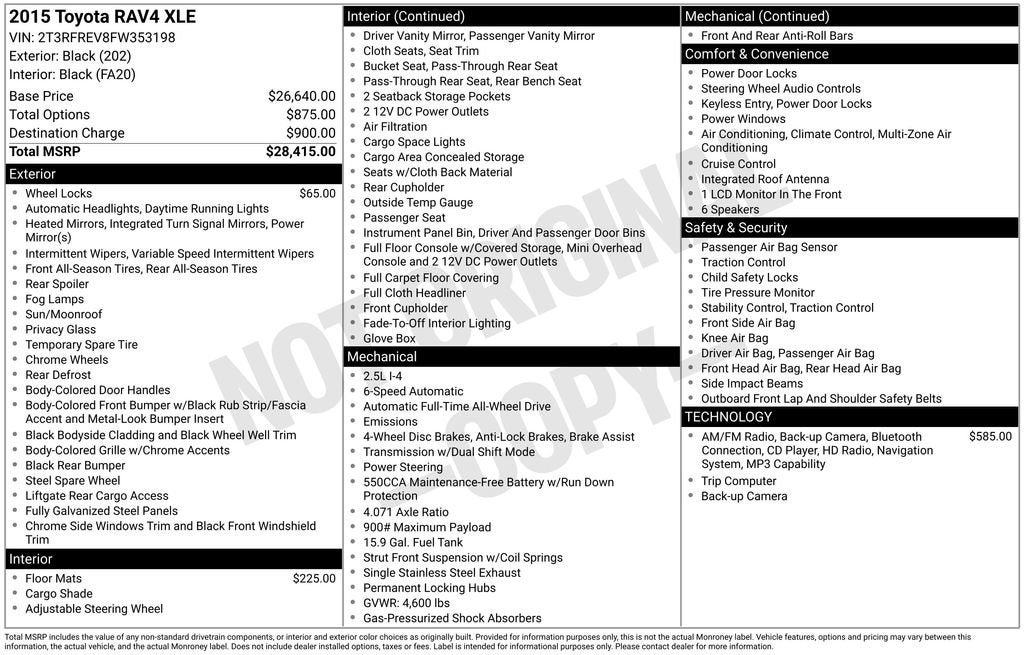 Tax, title, license and dealer fees (unless itemized above) are extra. Not available with special finance or lease offers. The Manufacturer’s Suggested Retail Price excludes tax, title, license, dealer fees and optional equipment. Dealer sets final price.