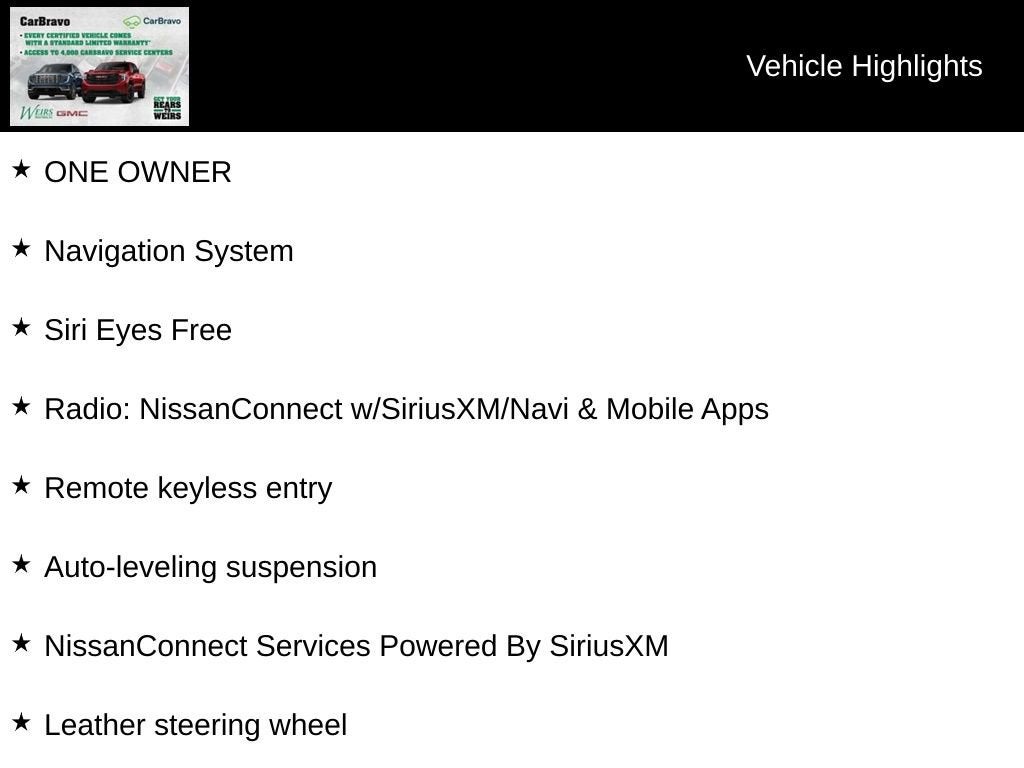 Elevate your driving experience with this remarkable 2018 Nissan Titan PRO-4X. Boasting a powerful 5.6L V8 engine and 4-wheel drive capabilities, this truck is ready to tackle any adventure with confidence.- ONE OWNER- SPLASH GUARDS- Radio: NissanConnect w/SiriusXM/Navi & Mobile Apps- Siri Eyes Free- Remote keyless entry- Auto-leveling suspension- Leather steering wheel- NissanConnect Services Powered By SiriusXM- Navigation System- Leather Seat Trim- Split folding rear seat- Wheels: 18 x 8 Painted Dark Finish AlloyWith its impressive 15 city / 20 highway MPG, this Titan PRO-4X delivers exceptional efficiency without compromising its robust performance. Enjoy the convenience of features like automatic temperature control, power driver's seat, and steering wheel-mounted audio controls, all while surrounded by the premium comfort of leather seating.This Titan has been meticulously maintained and is certified, giving you the peace of mind that comes with a thorough inspection and warranty coverage. Discover the perfect blend of capability, technology, and style in this well-equipped Nissan Titan PRO-4X.Why Buy from Weirs Buick GMC?Weirs Buick GMC has proudly served Arundel, Kennebunk, Kennebunkport, and all of Maine for over 65 years. Our dedicated team ensures that whether you're looking to buy, sell, or lease a Buick or GMC in Maine, your experience is seamless and enjoyable. We serve customers from Westbrook, Portland, Augusta, Auburn, Sanford, Portsmouth, and across New England.As your trusted GMC dealer in Maine, we offer competitive pricing comparable to other GMC and Buick dealers in the region. In addition to our wide selection of vehicles, we sell and service Fisher snow plows, ensuring you're ready for Maine's tough winters. Conveniently located on Route 1 in Arundel, we invite you to stop in and see why we've been the go-to dealership for generations.Visit us online at www.weirsbuickgmc.com or stop by today to experience the Weirs difference!Some vehicle images may be digitally enhanced to improve online presentation. These images may not display all cosmetic detai